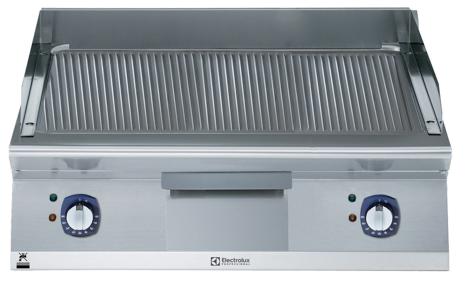 BAKPLAAT, geborsteld chroom, geribd, 730x540x12 mm, 2 zones, schuin aflopend, thermostatisch, schraper, topmodel, elektrisch* Elektrisch verwarmde bakplaat 730x540x12 mm, geribd,