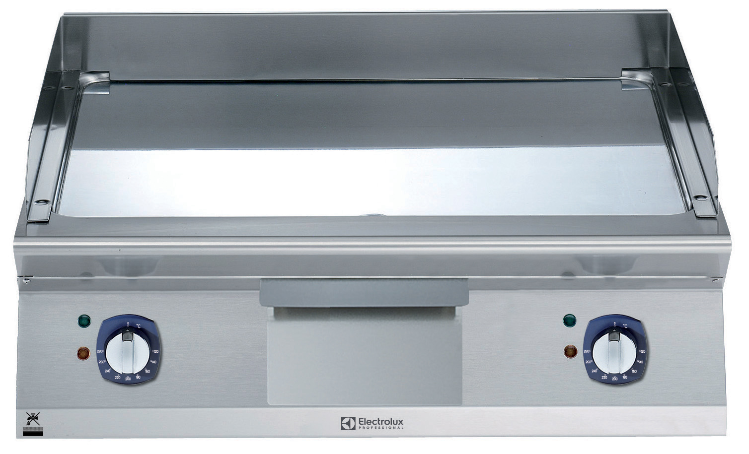 BAKPLAAT, gepolijst chroom, glad, 730x540x12 mm, 2 zones, schuin aflopend, thermostatisch, schraper, topmodel, elektrisch* Elektrisch verwarmde bakplaat 730x540x12 mm, glad,